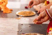 kobieta w czerwony mekhla gospodarstwa religijnych oferuje