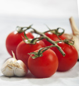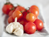 pomidory wiśniowe zielonej cebuli i czosnku zbliżenie