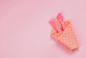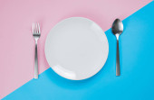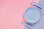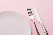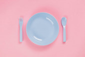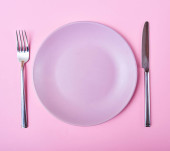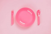 Różowa plastikowa płytka z łyżką i widelcem na różowym tle