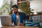 Młody architekt siedzi przy biurku w biurze, używając smartfona.