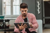 Młody mężczyzna siedzi na schodach w biurze, używając tabletu.