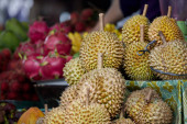Grupa świeżych owoców duriana na lokalnym rynku