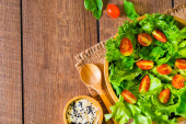 Zdjęcie "Świeża sałatka warzywna. powyżej pomidora wiśniowego, cebuli, szpinaku i sałaty w drewnianej misce z łyżką, sosem sezamowym sałatkowym. Domowej roboty, dietetyczne jedzenie na smaczny i zdrowy posiłek. Widok z góry, przestrzeń kopiowania." może być wykorzystywane do celów osobistych i komercyjnych zgodnie z warunkami zakupionej licencji Royalty-free. Obraz jest dostępny do pobrania w jakości wysokiej rozdzielczości do 5760x3840.