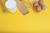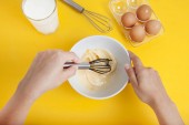 Ręce kobiety trzepają jajkami w łuk. Gotowanie omleta na śniadanie. Widok z góry procesu gotowania. Ciemne tło.