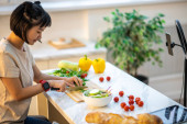 Młoda energiczna kobieta wyciągająca świeże warzywa z opakowania.