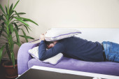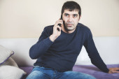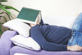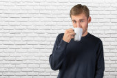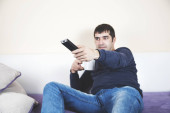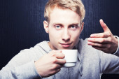człowiek strony kubki i dobrze znak siedzi na kanapie