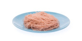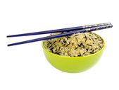 trzymanie pszennych cienkich makaronów pałeczkami na misce wyizolowanej na białym tle