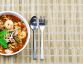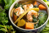 tajskie jedzenie, kang liang, krewetki mushhroom i warzyw na stole