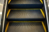 Zbliżenie schodów ruchomych w tle stacji kolejowej niebo