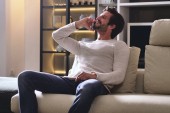 Zdjęcie "Facet pijący wino w domu. Pojęcie alkoholizmu" może być wykorzystywane do celów osobistych i komercyjnych zgodnie z warunkami zakupionej licencji Royalty-free. Obraz jest dostępny do pobrania w jakości wysokiej rozdzielczości do 5760x3840.