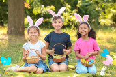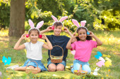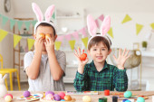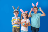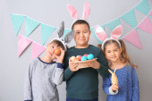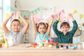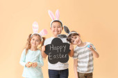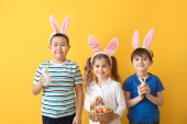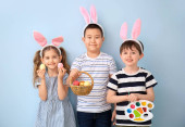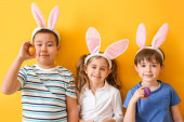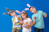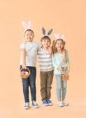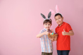 Małe dzieci z jajkami wielkanocnymi i uszami króliczka pokazujące gest kciuka w górę na tle koloru