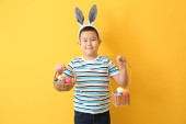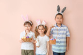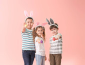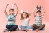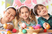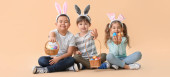 Małe dzieci z pisankami i paletą farb na tle koloru