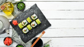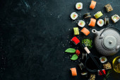 Sushi rolls - Kioto z łososiem, ogórkiem i sałatką Chuka. Bar z sushi. Jedzenie japońskie