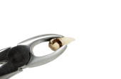 próchnicy zniszczony z dużą jamą usunięty ząb ludzki w kleszcze chirurgiczne, zęby trzonowe, ząb mądrości, operacja ekstrakcji zębów, chirurgia stomatologiczna, opieka stomatologiczna