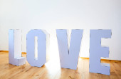 Z kartonu duże białe litery, słowo MIŁOŚĆ składa. Schemat ogłoszenia w sezonie.