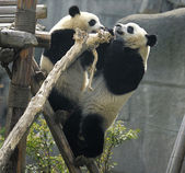 Panda matka i szczenię w Chengdu Panda Reserve (Chengdu Research Base of Giant Panda Breeding) w Syczuanie, Chiny. Dwie pandy patrzące na siebie. Panda z młodym w rezerwacie Panda w Chengdu, Chiny