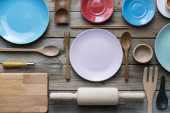 naczynia kuchenne do gotowania na drewnianym czarnym stole, jedzenie przygotować koncepcję