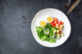Ketogenic, paleo diet lunch bowl with solted salmon fish, lemon, awokado, oliwki, gotowane jajko, ogórek, sałata zielona i nasiona chia, trend zdrowej żywności, widok z góry
