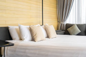 Zdjęcie "Biała wygodna poduszka na dekoracji łóżka wnętrze pokoju w ośrodku hotelowym" może być wykorzystywane do celów osobistych i komercyjnych zgodnie z warunkami zakupionej licencji Royalty-free. Obraz jest dostępny do pobrania w jakości wysokiej rozdzielczości do 5760x3840.