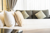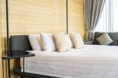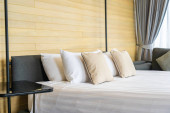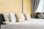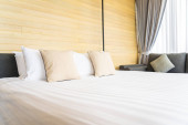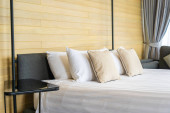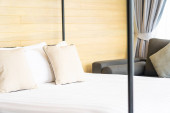Biała wygodna poduszka na dekoracji łóżka wnętrze pokoju w ośrodku hotelowym