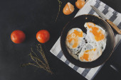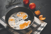 Omelette w czarnej patelni, ciemne zdjęcie żywności. Najlepszy widok na zdrowe śniadanie. Przestrzeń kopiowania.