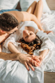 selektywne skupienie się szczęśliwej młodej pary trzymającej się za ręce leżącej razem w łóżku
