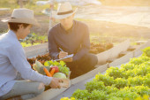Dwóch młodych Azjatów sprawdzających i odbierających organiczne świeże warzywa w hydroponicznym gospodarstwie rolnym i piszących dokumentację hodowlaną liści dla wysokiej jakości produktów, koncepcja właściciela małej firmy.