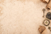 widok z góry kluczy vintage i kompas w pobliżu pióra na starszym papierze