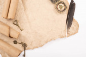 widok z góry na pióra, klucze vintage i kompas na starszym papierze izolowane na białym
