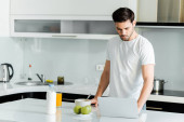 brodaty mężczyzna pijący świeży koktajl w pobliżu blendera i owoców