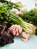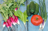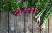 Organiczne, wiosenne warzywa (rzodkiewka, cebula, sałatka, ogórek) na starym drewnianym stole z przestrzenią do kopiowania
