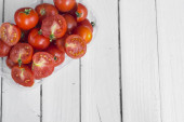 Pomidory wiśniowe na starym białym tle z miejscem na tekst