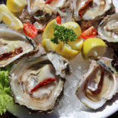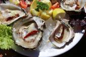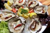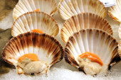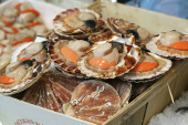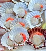 Świeże przegrzebki na płycie na targu w Palmie. Majorka