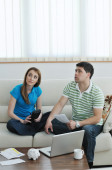 Zdjęcie "Młoda para działa na laptopie w domu" może być wykorzystywane do celów osobistych i komercyjnych zgodnie z warunkami zakupionej licencji Royalty-free. Obraz jest dostępny do pobrania w jakości wysokiej rozdzielczości do 5760x3840.