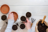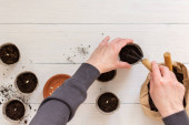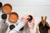 Zdjęcie "Przyjazne dla środowiska doniczki do sadzonek i małej torby z podłożem i łopatą ogrodową na białym drewnianym tle, żeńskie dłonie z grabiami i nasionami, sadzenie nasion ogórka, widok z góry" może być wykorzystywane do celów osobistych i komercyjnych zgodnie z warunkami zakupionej licencji Royalty-free. Obraz jest dostępny do pobrania w jakości wysokiej rozdzielczości do 5760x3840.