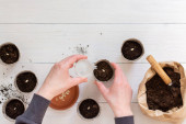 Zdjęcie "Przyjazne dla środowiska doniczki do sadzonek i małej torby z podłożem i łopatą ogrodową na białym drewnianym tle, żeńskie dłonie z grabiami i nasionami, sadzenie nasion ogórka, widok z góry" może być wykorzystywane do celów osobistych i komercyjnych zgodnie z warunkami zakupionej licencji Royalty-free. Obraz jest dostępny do pobrania w jakości wysokiej rozdzielczości do 5760x3840.