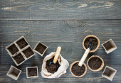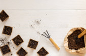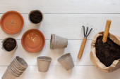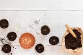 Przyjazne dla środowiska doniczki do sadzonek i małej torby z podłożem i łopatą ogrodową na białym drewnianym tle, żeńskie dłonie z grabiami i nasionami, sadzenie nasion ogórka, widok z góry
