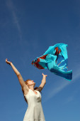 młoda dziewczyna z turbin wiatrowych na polu rzepaku.