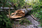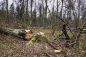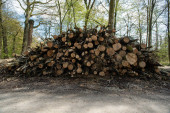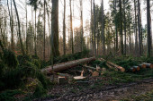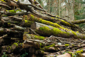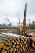 Splintered pnia drzewa w lesie obok cięcia dzienników słoneczny dzień 2020