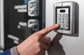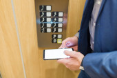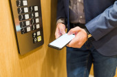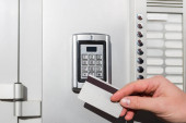 Mężczyzna skanujący kartę bezpieczeństwa na zamku elektrycznym do wejścia do prywatnego budynku.