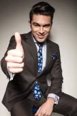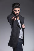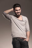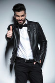 młody brodaty mężczyzna uśmiecha się i wskazując palcem