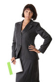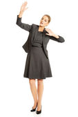 młody biznes Kobieta wskazując na lato na białym tle ov