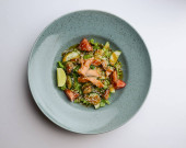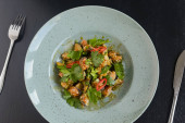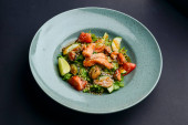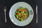 Sałatka ze świeżych warzyw grillowanych na niebieskim talerzu na czarnym rustykalnym drewnianym tle.