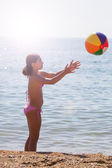 dziewczynka gra w piłkę w zatłoczonych nadmorskich