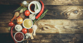 Wiele różnych przypraw, warzyw i składników, i świeże surowe kiełbasy grillowe dla rodziny.