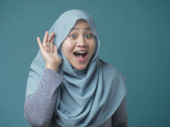 Portret szczęśliwy kobiety Muzułmańskie świętuje zwycięstwo, wygrywając gest uśmiechając się i coś z góry z koncepcją przestrzeni kopii pozdrowienie