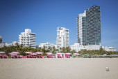 Piękny widok na wybrzeże Miami South Beach. Piaszczysta plaża, Ocean Atlantycki, ludzie na tle błękitnego nieba. Jestem z USA. Plaża Miami. 09.24.2019.