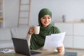 Islamska bizneswoman pracuje na laptopie w biurze i pisze notatki