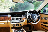 Nowosybirsk, Rosja 31 stycznia 2020: Land Rover Range Rover, luksusowy samochód Wnętrze - kierownica, dźwignia zmiany biegów, system multimedialny, fotele kierowcy i deska rozdzielcza
