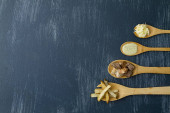 Płaska leżała z różnymi rodzajami tradycyjnego włoskiego makaronu. Penne, tagliatelle, fusilli, farfalle, spaghetti i inne. Tradycyjna włoska kuchnia. Widok z góry